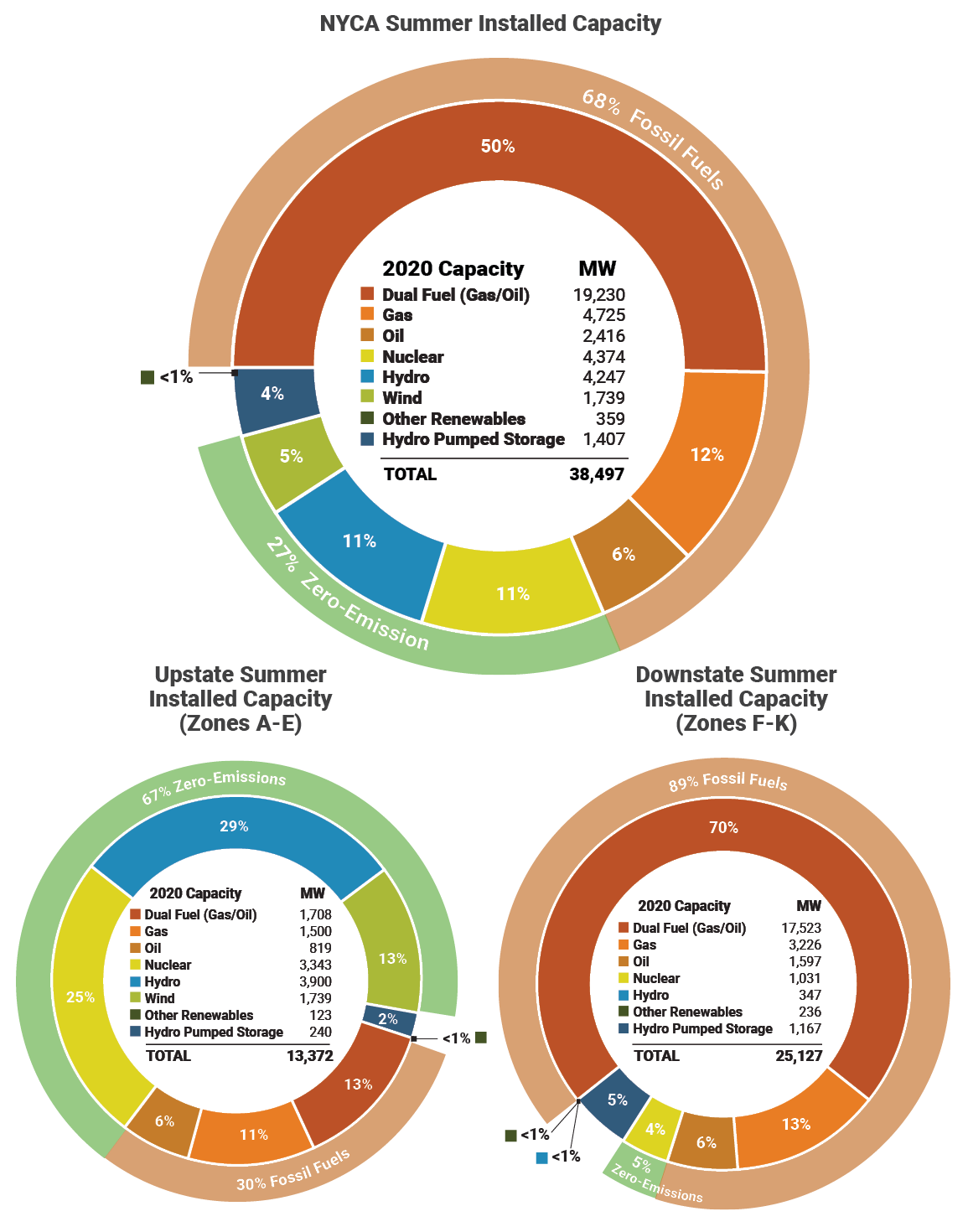 FERC’s BSM orders exemplify structural barriers to a clean and just energy transition because they block the development of clean resources precisely where the state’s dirtiest, least-efficient power plants are located. As NYISO’s graph below shows, New York is a tale of two grids. In 2019, the Upstate region’s energy supply was 88 percent renewable, while the Downstate region’s supply was 70 percent fossil fuel due to transmission constraints and the challenges of siting renewable energy in densely populated urban areas. NYISO’s capacity commitments in these two regions are similarly disparate.